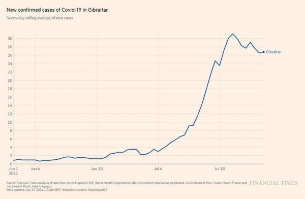 There were no more than two new COVID-19 cases per day in Gibraltar from June 1 to June 22. That number has rapidly increased, peaking at 31 new cases per day by July 20, a 3,000% increase, according to the Financial Times. The number now hovers around 27 new cases per day.