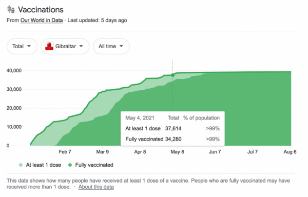 Gibraltar is 99% fully-vaccinated, and has been that way since May 4.