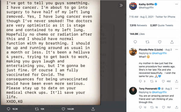 The 60-year-old comedian and actress announced August 2 on Twitter that she has lung cancer. There are two things that stick out in the tweet. Griffin pointed out that she has never smoked a cigarette (or, we assume, never worked in an asbestos-infested factory), but still contracted lung cancer. The second part is both bizarre and telling. Griffin said, “I am fully vaccinated,” and insinuated she would rather have lung cancer than COVID-19.